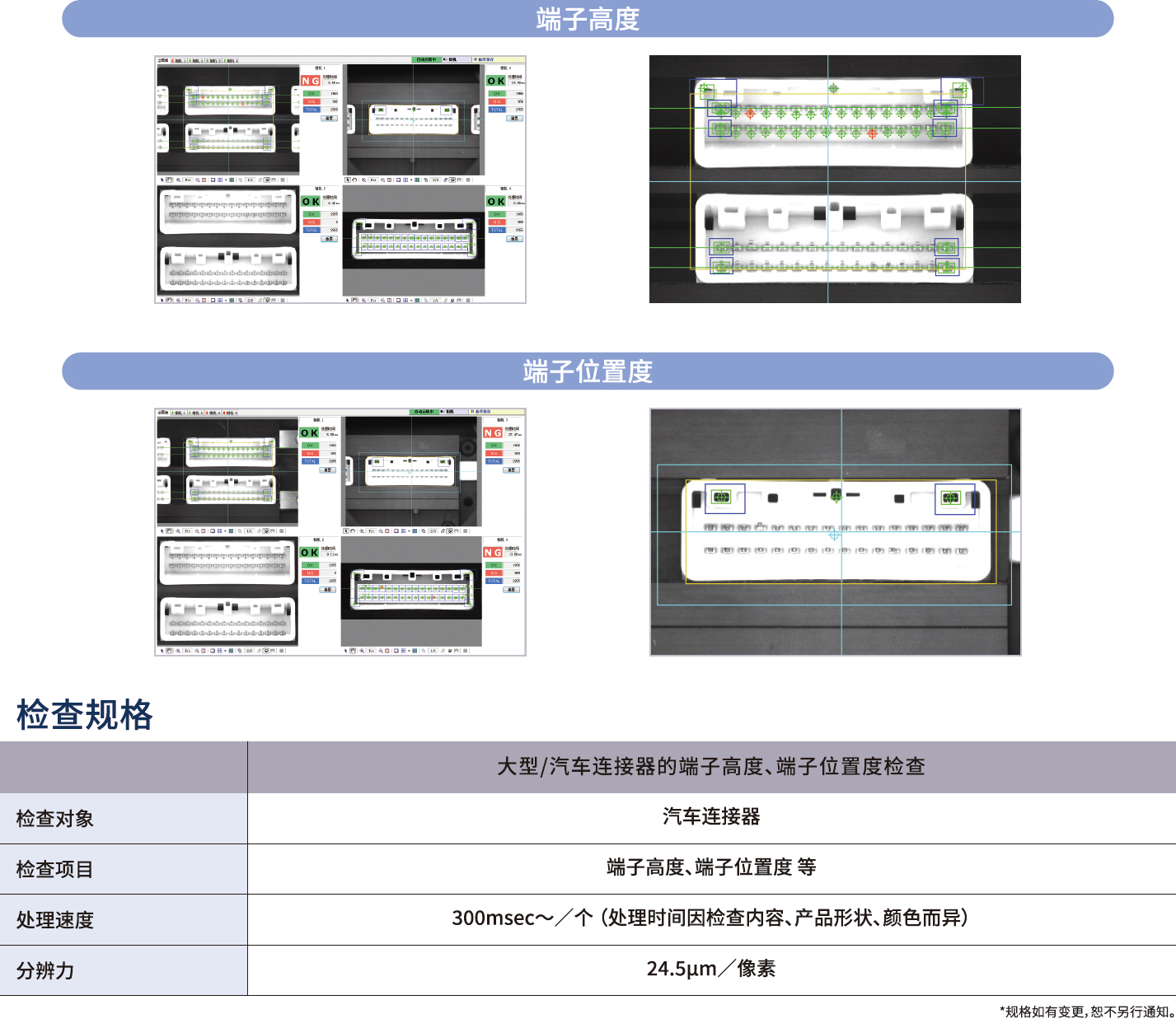 大型/自動車コネクタの端子高さ、端子位置度検査は1臺のカメラで端子高さの検査を?qū)g現(xiàn)!自動車用コネクタ、産業(yè)用コネクタの端子高さ及び端子位置度の點(diǎn)検。VISCOのエンジニアリング技術(shù)により、1臺のカメラで端子の高さを測定することができます。